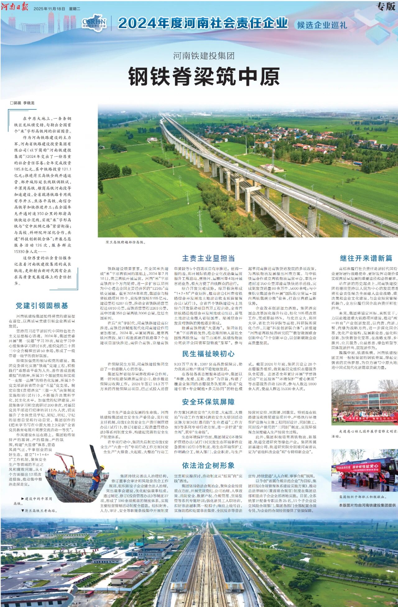 作為河南鐵路建設(shè)的主力軍,河南省鐵路建設(shè)投資集團(tuán)有限公司(以下簡稱“河南鐵建投集團(tuán)”)2024年交出了一份厚重的社會(huì)責(zé)任答卷:全年完成投資185.8億元,其中鐵路投資121.1億元;推進(jìn)菏蘭高鐵全線開通運(yùn)營、鄭開城際延長線聯(lián)調(diào)聯(lián)試,平漯周高鐵、雄商高鐵河南段等加速建設(shè),全省疏港鐵路專用線有序開工,焦洛平高鐵、南信合高鐵等加快推進(jìn)開工;在全國率先開通時(shí)速350公里的鄭渝高鐵快運(yùn)示范線,實(shí)現(xiàn)“米”字形高鐵與“空中絲綢之路”緊密銜接;與高校、科研院所深化合作,共建“科技創(chuàng)新聯(lián)合體”;開展志愿服務(wù)活動(dòng)126次,服務(wù)群眾15330余人次……